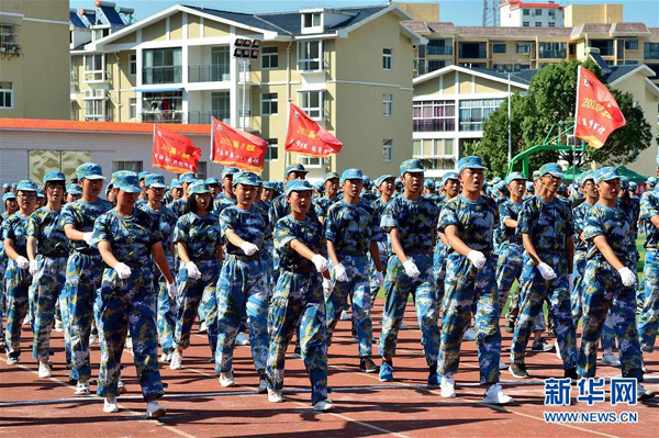 8月28日,新生在湖北省襄陽市保康縣第一中學參加軍訓。新華社發(楊韜 攝)