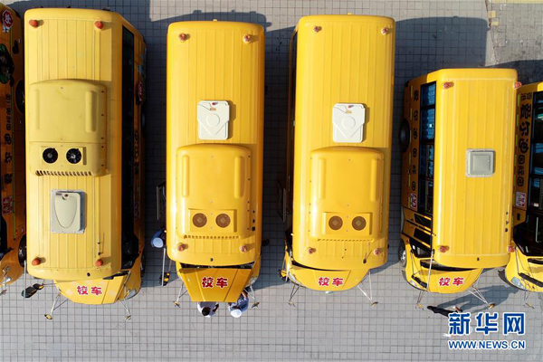 8月23日,河北省邢臺市公安交警支隊開發區大隊民警對轄區校車進行安全檢查(無人機拍攝)。新華社發(陳雷 攝)