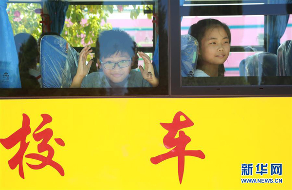 8月23日,興化市臨城中心校學生體驗即將投入使用的新校車。新華社記者 李雨澤 攝