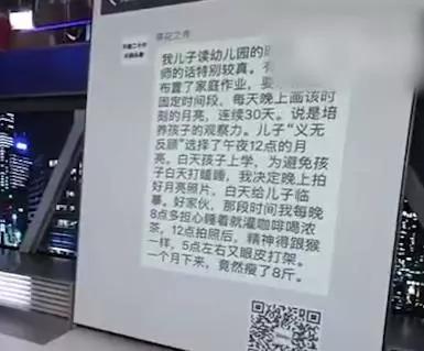 最近,有網(wǎng)友在網(wǎng)上抱怨說,孩子上幼兒園時,老師布置了一道“奇葩作業(yè)”——每天晚上畫同時間的月亮,連續(xù)30天。