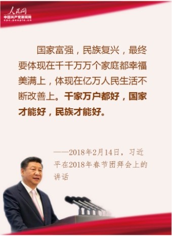 團聚最喜悅,團圓最幸福,團結最有力。春節是萬家團圓的日子。中華民族歷來重視家庭,家和萬事興。國家富強,民族復興,最終要體現在千千萬萬個家庭都幸福美滿上,體現在億萬人民生活不斷改善上。