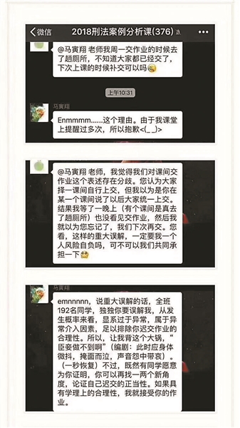 據許同學介紹,馬老師刑法案例課成績是由幾次平時作業的平均分產生,因此,一次不交作業會影響到最后的成績。發現只有自己沒交作業后,18日,許同學在課程群里詢問馬老師能否遲交,馬老師回復因為已經多次提醒所以無法遲交。許同學解釋:“我們對課間交作業這個表述存在分歧,針對這樣的重大誤解,可不可以共同承擔風險?”