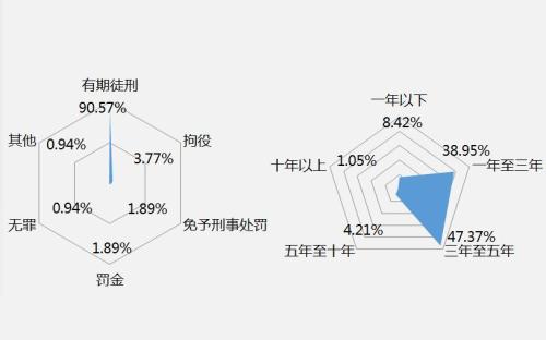 有期徒刑刑期及占比分別為:一年以下(8.42%),一年至三年(38.95%),三年至五年(47.37%),五年至十年(4.21%),十年以上(1.05%)。
