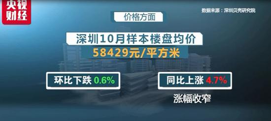 價格方面,深圳貝殼研究院數據顯示,深圳10月樣本樓盤均價為58429元/平方米,環比下跌0.6%,同比上漲4.7%,漲幅收窄。