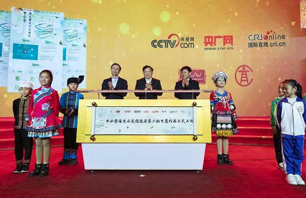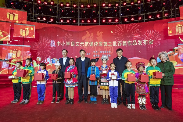 2018年12月23日下午,中央廣播電視總臺、教育部、國家語委聯合舉辦“中小學語文示范誦讀庫”第二季作品發布會。中宣部副部長、中央廣播電視總臺臺長慎海雄,教育部副部長、國家語委主任杜占元,中央廣播電視總臺副臺長閻曉明出席發布會,并共同見證第二批100篇音頻教材正式上線發布。新華社記者沈伯韓 攝