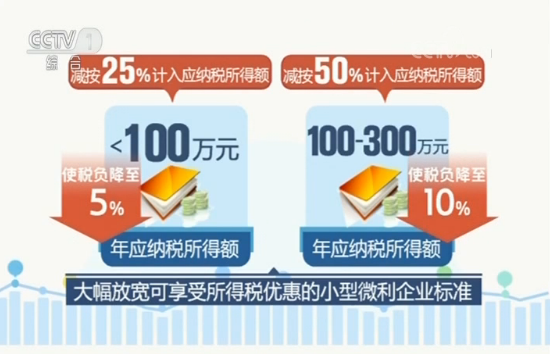 一是大幅放寬可享受所得稅優惠的小型微利企業標準,對其年應納稅所得額不超過100萬元、100萬元到300萬元的部分,分別減按25%、50%計入應納稅所得額,使稅負降至5%和10%。這一優惠將覆蓋95%以上的納稅企業,其中98%為民營企業。