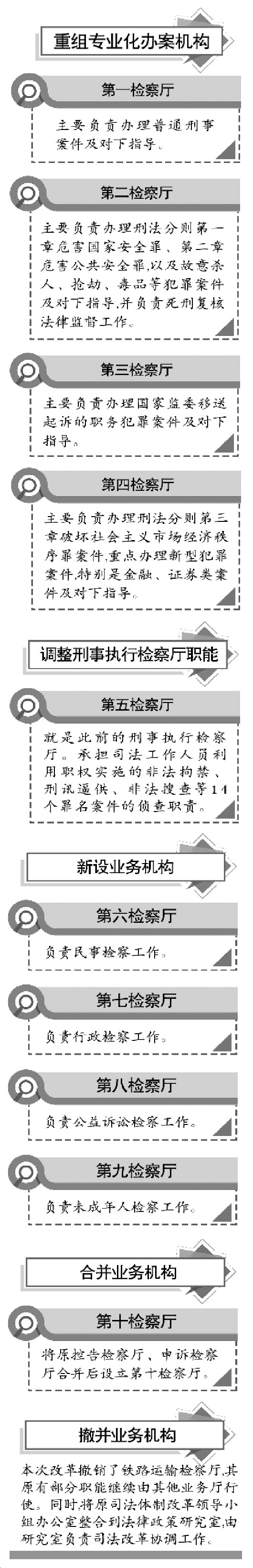 12月17日,最高檢召開機關內設機構改革動員部署大會,將原偵查監督廳、公訴廳、公訴二廳、刑事執行檢察廳、民事行政檢察廳、控告檢察廳、申訴檢察廳、鐵路運輸檢察廳、未成年人檢察工作辦公室、司法體制改革領導小組辦公室、監察局、巡視工作領導小組辦公室等部門整合、優化,重新組建為第一至第十檢察廳。