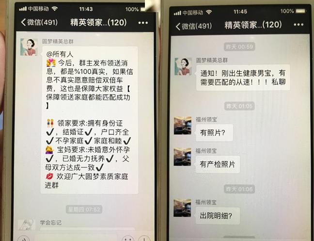 “圓夢之家精英群”就是這樣一個“升級”的販嬰群。2年多的潛伏時間里,“可樂”曾多次提出讓仔仔去見孩子,但是為了減少對方的懷疑,仔仔多次推辭,“我越推辭,他就會覺得我越謹慎,越相信我是真的‘買家’”。