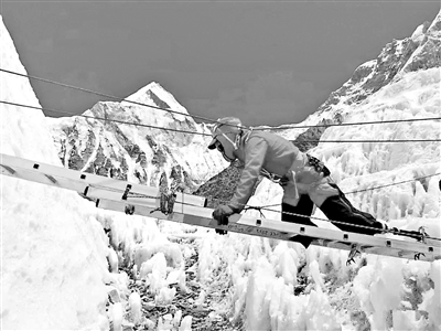 要說危險(xiǎn)的也是最困難的,還是攀登珠峰的過程中,會(huì)遇到很多大大小小的冰裂縫,這些裂縫走向不明,深不見底,一旦墜入很可能丟掉性命。這時(shí)需要在裂縫上架梯子通過。人走在一尺寬的梯子上面會(huì)上下晃動(dòng),這對(duì)于使用假肢無法保持身體平衡的夏伯渝來說非常困難。登山杖失去作用,只能靠爬。而對(duì)于更多一米來寬的裂縫,一般人能一步跳過去,而受假肢限制,他只能大步跨。但這要危險(xiǎn)得多,夏伯渝假肢沒有踝關(guān)節(jié)的緩沖,跨過去時(shí)重心是后仰的,很容易掉到裂縫中。這需要在裂縫對(duì)面的隊(duì)友,在其跨過的瞬間,適時(shí)把他拉過去。如果拉早了,假肢還沒有接觸到對(duì)岸,人就會(huì)掉到深不可測(cè)的裂縫中;如果拉晚了,夏伯渝身體產(chǎn)生的后坐力很有可能將幾個(gè)人一起拖入無底深淵。在隊(duì)友的幫助下,夏伯渝順利跨過了登頂珠峰途中遇到的近30個(gè)大大小小的冰裂縫。