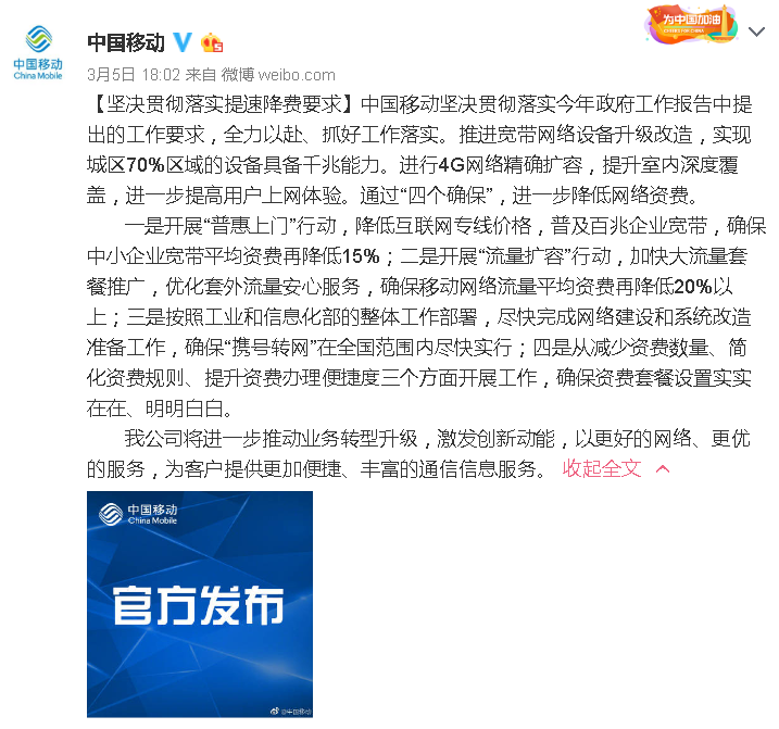 總理和部長的話音剛落,三大運營商當天均通過官微作出回應——