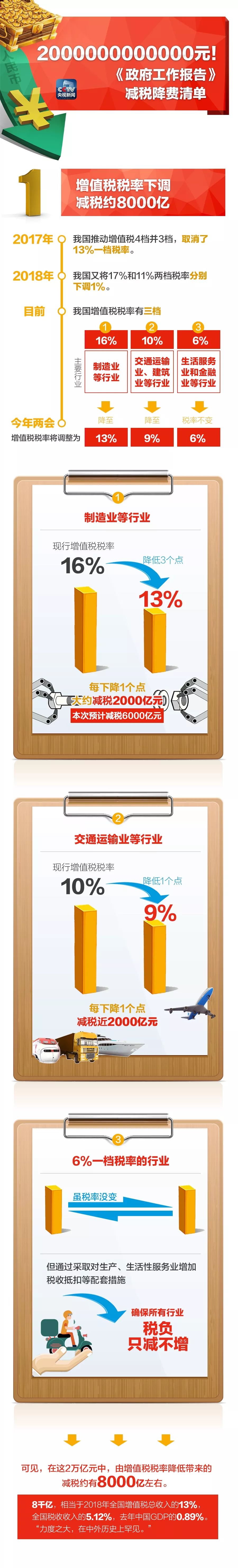 央視網消息:今年的政府工作報告指出,全年將減輕企業稅收和社保繳費負擔近2萬億元。這2萬億元主要將會降在哪里?哪些行業減稅降費比較多?一張圖告訴你↓