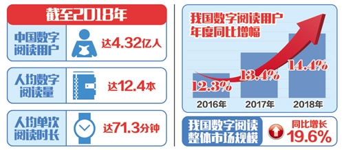 4月12日至14日,第五屆中國數字閱讀大會在杭州召開。會上發布的《2018年度中國數字閱讀白皮書》顯示,截至2018年,中國數字閱讀用戶總量達到4.32億,人均數字閱讀量達到12.4本,人均單次閱讀時長達71.3分鐘。我國數字閱讀整體市場規模已達到254.5億元,同比增長19.6%,大眾閱讀市場規模占比逾九成,是產業發展主導力量。
