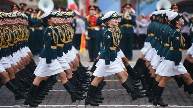 今年共有35個徒步方陣參加了勝利日閱兵,其中,英姿颯爽的女兵方陣尤為亮眼,值得一提的是,今年還有一個排的女兵首次在儀仗隊中亮相。據(jù)介紹,今年接受檢閱的女兵來自不同軍事學院,其中來自“空天防御軍事學院”的女兵方陣是首次亮相勝利日紅場閱兵。而女兵首次在儀仗隊中亮相也將閱兵推向一個高潮。