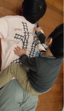 免費按摩?老爸在T恤背面印鐵軌供孩子玩火車