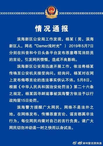 通報稱,天津濱海新區公安局工作發現,楊某(男,濱海新區人,網名“Damer淺時光”)2019年5月7日分別在抖音和今日頭條平臺發布惡意辱罵消防員的言論,引發網民憤慨,造成不良影響。