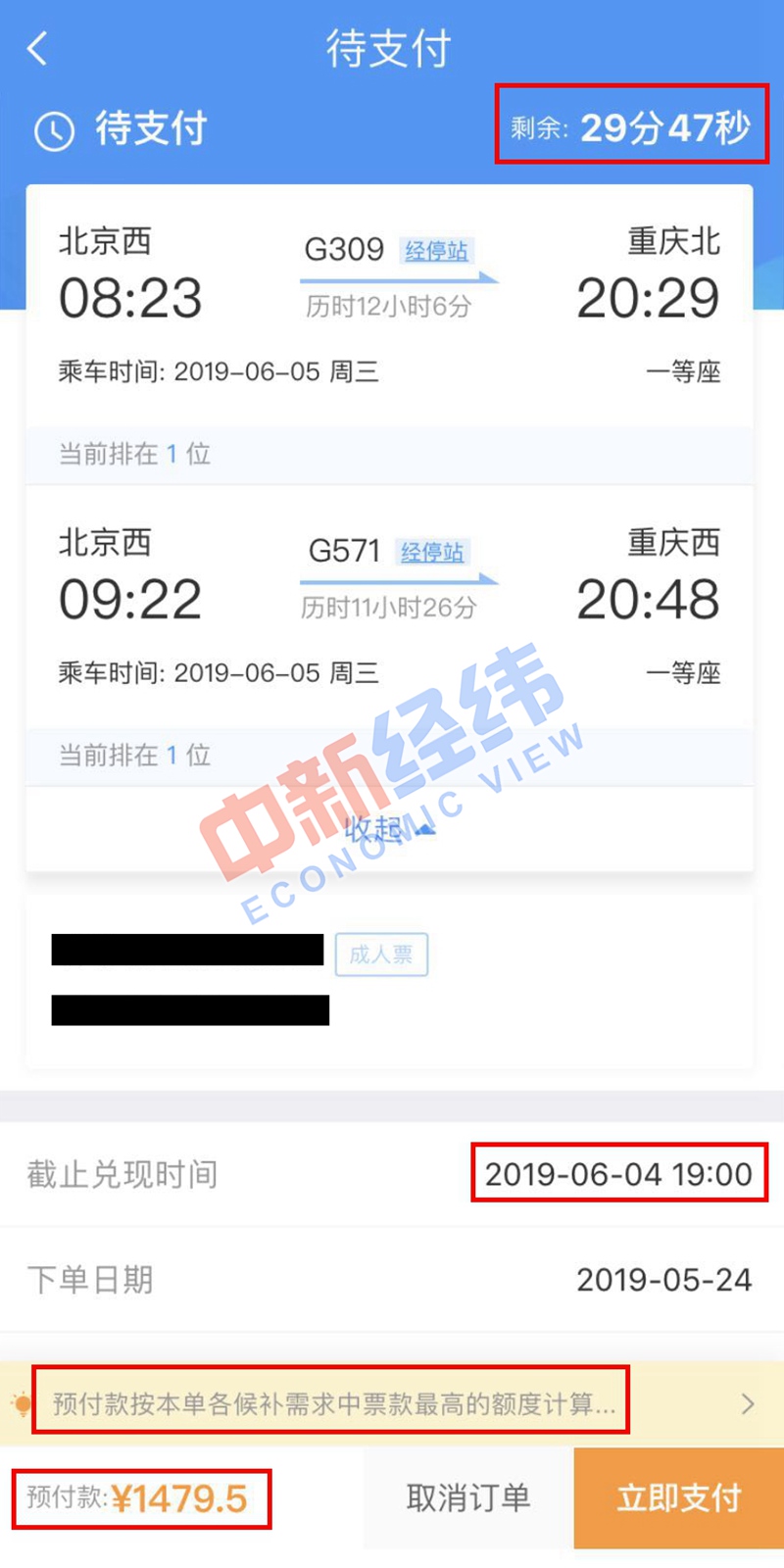 5、支付候補訂單。值得注意的是,候補訂單的支付需要在30分鐘內完成,預付款按本單各候補需求中票款最高的額度計算。如果候補成功(即在兌現時間前搶到車票),預付票款中多出的部分,將自動退回差額給原賬戶;如果候補購票失敗(即在兌現時間前未搶到車票),預付款將全額退回。