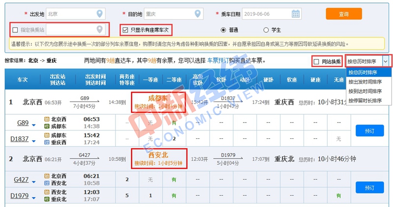 2、換乘過程中,存在同站換乘和不同車站換乘兩種情況。在列車余票信息頁面,旅客可根據需求,對“指定換乘站”“只顯示有座席車次”“同站換乘”等信息進行勾選。此外,車票信息還可以根據總歷時、出發、到達、停留時間進行排序。