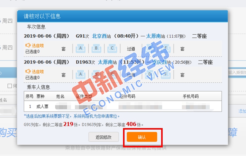4、一切準備就緒后,就可進行車票預訂了。點擊“預訂”后,系統會再次對換乘信息進行提示,確認無誤后選擇對應車次所需席別,添加乘車人信息。