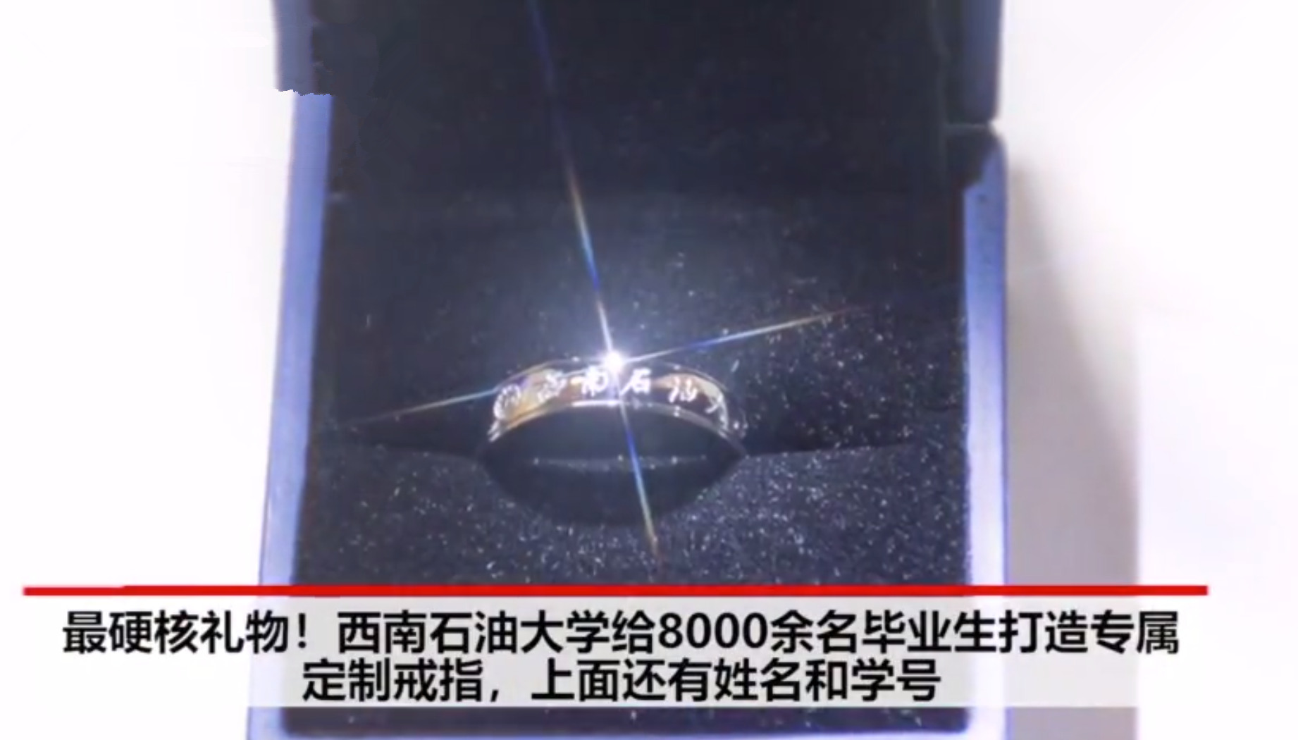 又是一年畢業季,四川西南石油大學為8400名畢業生每人定制了一枚專屬鈦鋼戒指,外圈刻有?;蘸托C?,內圈則是學生名字和學號。同學們收到后紛紛表示太驚喜,“特別是盒子打開有個燈照著戒指,看起來就像還有鉆石一樣,真的很用心!”網友:實名羨慕