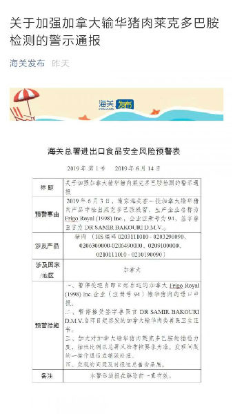 參考消息網6月20日報道?外媒稱,中國海關總署6月18日稱,暫停從一家加拿大公司進口豬肉產品,此前在該公司輸華豬肉產品中檢出萊克多巴胺(俗稱“瘦肉精”)。