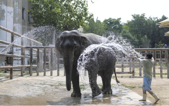 ●山東濟南天氣炎熱,6月19日,濟南動物園的的工作人員用各種方法為動物降溫。