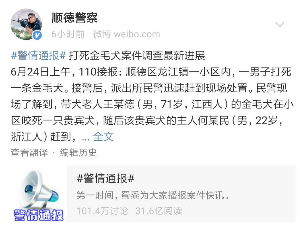 警方通報打死金毛犬案件最新進展:暫未發現涉事男子毆打老人