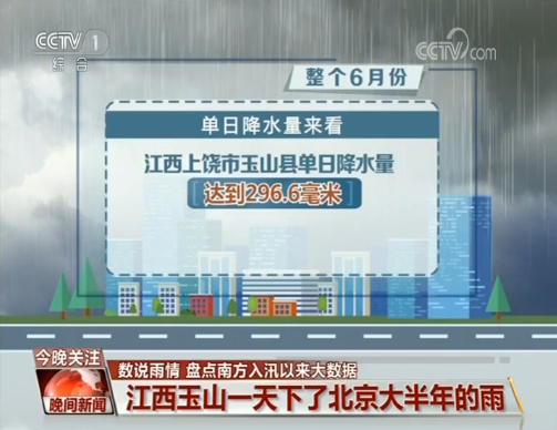 整個6月,南方共有19地累積降雨量突破500毫米,其中最大降雨量出現在福建龍巖,達到680.1毫米。單日降水量來看,江西上饒市玉山縣單日降水量達到296.6毫米,而根據統計,北京年均降水量為514毫米,玉山縣的這個單日降雨量,大約是北京年降水量的五分之三。