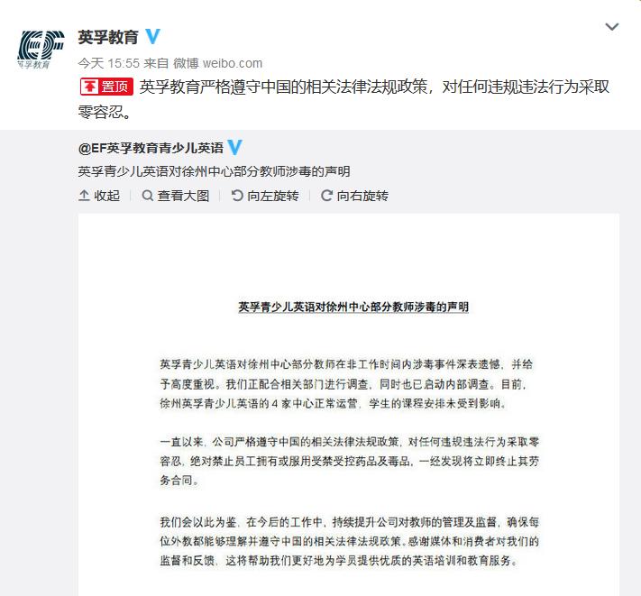 10日下午,英孚青少兒英語就徐州中心部分教師涉毒發表聲明。聲明提到,英孚正配合相關部門進行調查,同時也已啟動內部調查。