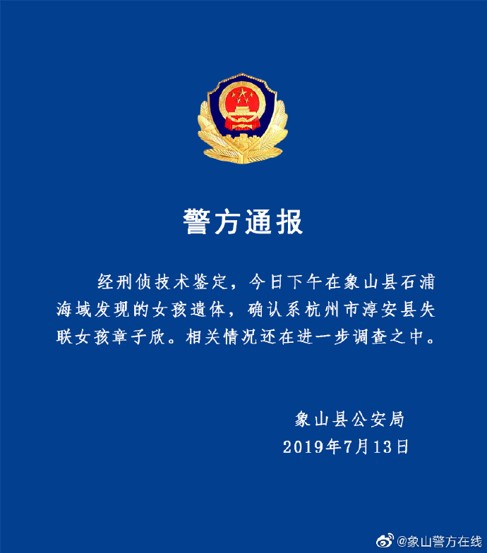 央視網消息(記者李珊珊 弟辰晨):“意外”終究沒有變成“奇跡”。據@象山發布,7月13日中午12時30分許,在象山石浦海域(東經121度59分、北緯29度12分)海面上發現一具女孩遺體。經刑偵技術鑒定,該女孩遺體就是失聯多日的章子欣。