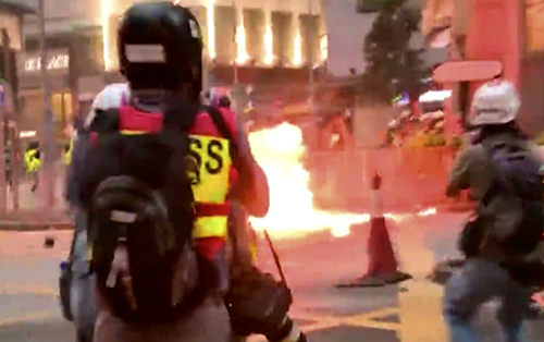8月11晚,有暴徒在香港深水埗大南西街向警察投擲汽油彈。(央視記者 包佳節)