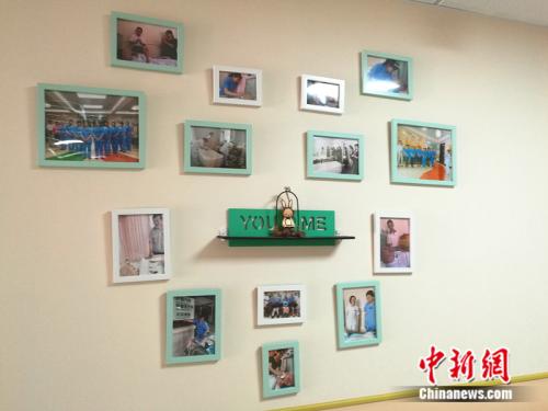 病房的走廊里專門設計了溫馨的照片墻。 中新網記者 張尼 攝