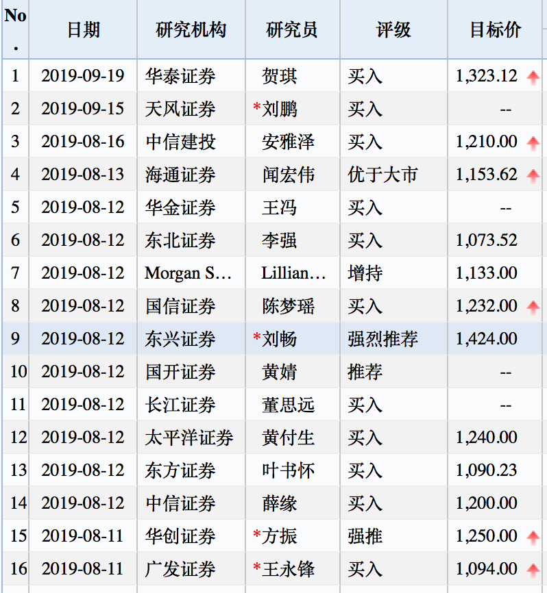 隨著股價的飆升,券商也持續看高貴州茅臺。據wind數據統計,半年內有36家券商給出買入評級。進入8月以來,部分券商給出的目標價已超過1200元,其中東興證券于8月12日給出的目標價高達1424元/股。