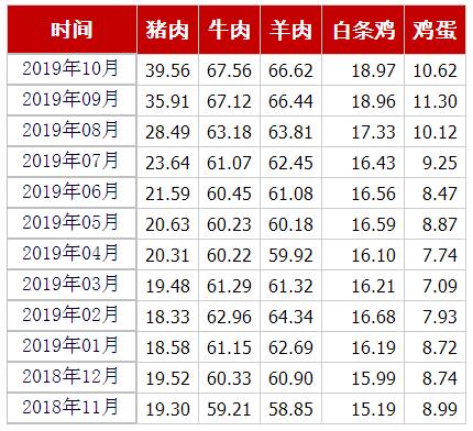 豬肉、牛肉、羊肉、白條雞、雞蛋均價(元/公斤) 來源:農業農村部官網截圖