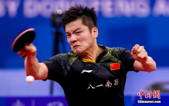 10月21日晚,第七屆世界軍人運動會乒乓球男子團體決賽在湖北省武漢市舉行,中國隊以3比1戰勝朝鮮隊獲得乒乓球男子團體冠軍。圖為中國隊樊振東在比賽中。中新社記者 張暢 攝