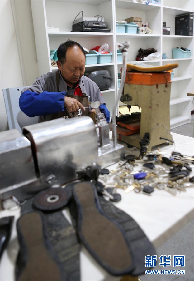 11月12日,鎖鞋匠鄧祖華在成都成華區二仙橋街道下澗槽社區黨群服務中心為他提供的工作間內忙碌。下澗槽社區在黨群服務中心為鎖鞋匠、縫紉師傅等提供免費場地,方便社區居民生活。 新華社記者 謝秀棟 攝