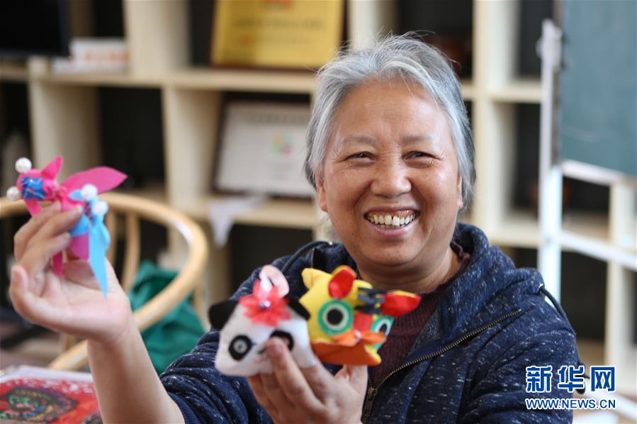 11月12日,在成都成華區二仙橋街道文化活動中心,一名社區居民展示自己做的手工作品。 新華社記者 謝秀棟 攝
