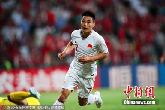 資料圖:11月14日,世預賽亞洲區40強賽中,國足客場1:2不敵敘利亞,比賽中對手先入一球,此后武磊凌空推射扳平比分,張琳芃不慎烏龍導致國足再度落后。圖為武磊在比賽中。圖片來源:Osports全體育圖片社