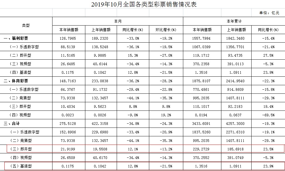 數據顯示,10月,即開型彩票銷售21.92億元,同比增長12.1%;基諾型彩票銷售0.12億元,同比增長12.8%。前10個月,即開型彩票銷售229.27億元,同比增長23.5%;基諾型彩票銷售1.35億元,同比增長23.9%。