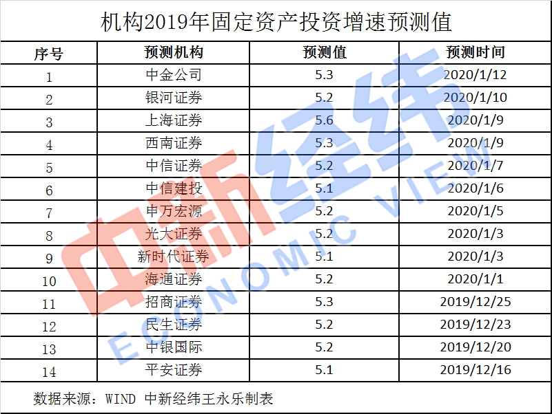 投資方面,WIND數據顯示,上海證券、西南證券等14家機構對2019年固定資產投資(不含農戶)增速平均預測值為5.2%,預測最大值為5.6%,最小值5.1%。
