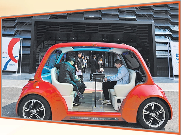 2019年10月21日,在浙江烏鎮舉行的互聯網之光博覽會會場外拍攝的5G 無人駕駛體驗車。新華社記者尹棟遜攝