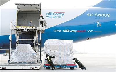 2月21日清晨8點半,在鄭州機場34號貨機位,阿塞拜疆絲綢之路西部航空公司一架貨機正在裝卸進口貨物。馬 健攝(人民視覺)