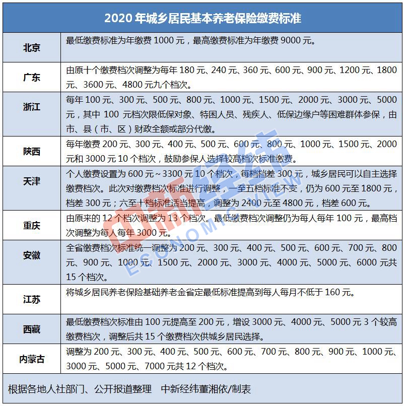 中新經緯客戶端梳理發現,除了北京之外,2020年1月1日起,包括廣東、浙江、陜西、天津、重慶、安徽、江蘇、西藏、內蒙古等省區市實施新修訂的城鄉居民基本養老保險實施方案。
