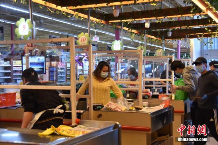 資料圖:當地時間4月6日,美國大華府地區的一家超市在結賬區收銀員和顧客之間設置玻璃隔斷,防止互相傳染。 中新社記者 沙晗汀 攝