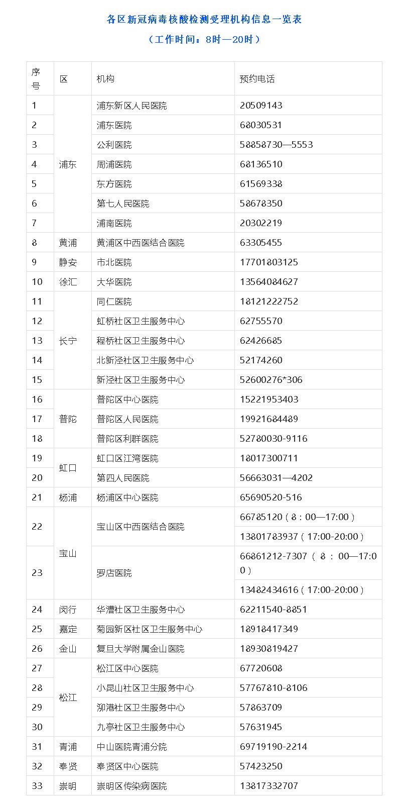 記者從上海市衛健委獲悉,為支持企事業單位和學校復工復產復學,滿足社會需求,上海市單位或個人可按照自愿自費原則,在以下機構預約開展新冠病毒核酸檢測。上海市衛生健康委將對相關檢測機構加強監督和指導。(總臺央視記者? 陸學賢)