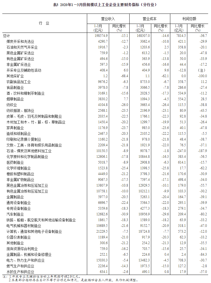 1—3月份,在41個工業(yè)大類行業(yè)中,2個行業(yè)利潤總額同比增加,39個行業(yè)減少。主要行業(yè)利潤情況如下:煙草制品業(yè)利潤總額同比增長28.5%,農副食品加工業(yè)增長11.2%,汽車制造業(yè)下降80.2%,化學原料和化學制品制造業(yè)下降56.5%,黑色金屬冶煉和壓延加工業(yè)下降55.7%,電氣機械和器材制造業(yè)下降47.0%,通用設備制造業(yè)下降39.9%,紡織業(yè)下降38.8%,專用設備制造業(yè)下降34.7%,非金屬礦物制品業(yè)下降34.0%,電力、熱力生產和供應業(yè)下降30.7%,有色金屬冶煉和壓延加工業(yè)下降30.2%,煤炭開采和洗選業(yè)下降29.9%,石油和天然氣開采業(yè)下降20.1%,計算機、通信和其他電子設備制造業(yè)下降12.0%,石油、煤炭及其他燃料加工業(yè)由上年同期盈利轉為虧損。