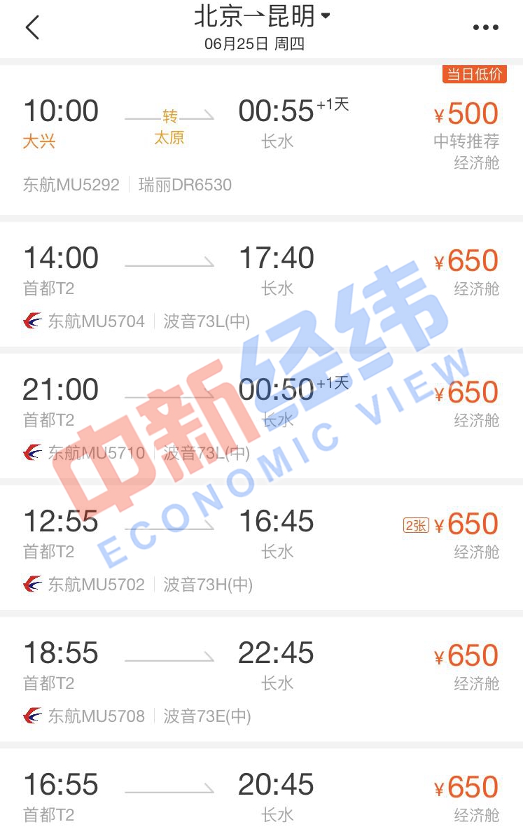 北京—昆明MU5292、MU5704、MU5710、MU5702、MU5708、MU5706、MU9027、MU5718、MU5292、MU9710、CZ3997、3U8723、3U8838、CZ6159、CA4174、KN5255等16個(gè)航班機(jī)票價(jià)格分別為500元、650元、650元、650元、650元、650元、700元、700元、700元、700元、800元、870元、870元、1000元、1000元、1017元。兩地間高鐵二等座需1147.5元。