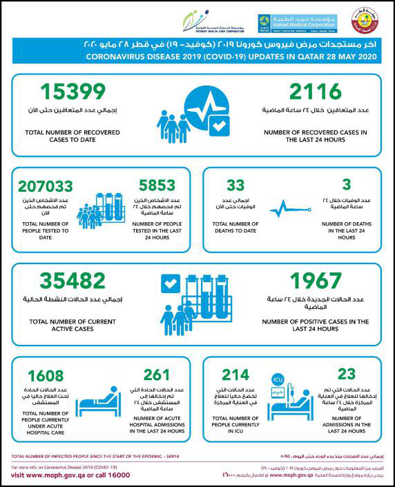 卡塔爾新冠病毒疫情持續增長,單日新增確診病例和單日治愈病例雙雙創新高,同時疫情發生以來,單日治愈病例數首次超過當日確診數。卡塔爾公共衛生部5月28日下午對外公布,在過去的24小時中,共進行了5853例新冠病毒肺炎測試,確診1967例,累計確診病例達50914例。當天卡塔爾還新增3例死亡病例,死者分別為81歲、50歲和25歲,生前均患有慢性疾病,全國累計死亡病例達33例。此外,卡塔爾當天還有2116名治愈患者,總治愈人數達15399例,目前仍有35482人處于治療中,其中1608人住院治療,214人在重癥監護室中。卡塔爾累計進行了207033例新冠病毒測試,確診人數約占總檢測人數的四分之一。