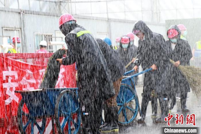 為了提升項目防汛搶險救災實戰能力,確保安全生產,一家央企用消防車模擬出突降暴雨的情形,來進行應急演練。 唐基真 攝