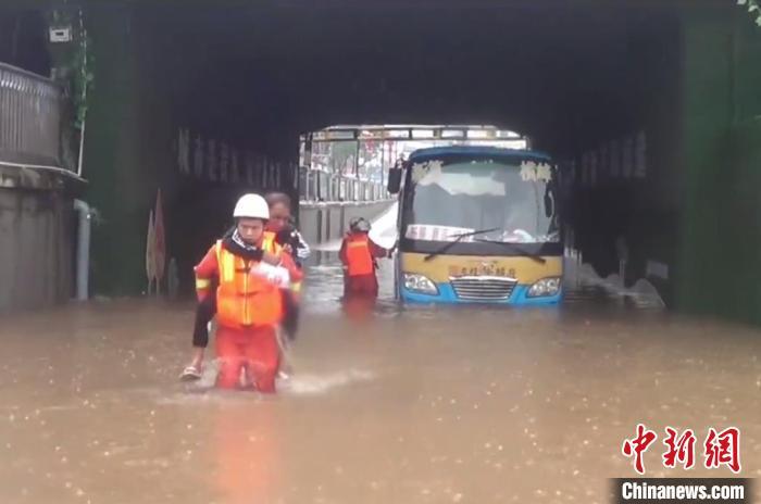 5月30日12時許,江西省上饒市橫峰縣鐵路橋洞下,積水最深處有約1米深。仍在上漲的積水致使橋洞下一輛大巴車熄火,車內2人被困,消防指戰員出動救援。 江西消防供圖