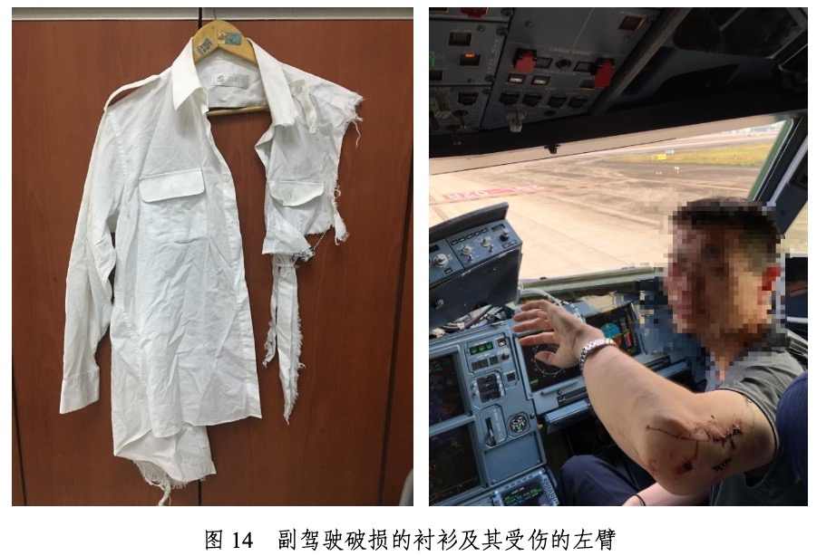 風擋脫落后出現了爆炸性座艙失壓,右座副駕駛被強大的外泄氣流帶離座位后,靠自身力量返回駕駛艙座椅。期間,副駕駛身體被駕駛艙儀表、風擋邊框等硬物挫傷或劃傷,身體受到安全帶的拉扯。經診斷,副駕駛右眼挫傷、左上臂皮膚挫傷、右小腿后側劃傷、雙側腹股溝挫傷,已于2018年5月21日出院。